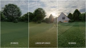En versiones previas de Lumion, había dos opciones de hierba. Por ejemplo, podías obtener un tipo de hierba 3D seleccionando hierba de paisaje en el editor de paisaje. La otra opción era aplicar el material hierba 2D en una superficie que eligieras.