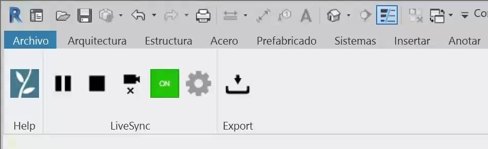 El complemento de Lumion LiveSync en Revit tiene una interfaz sencilla y directa con opciones como Play / Pause LiveSync, Stop y Configuración.