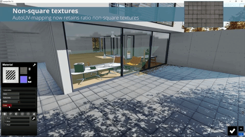 ¿Tienes tus propios materiales favoritos? Con Lumion 7.5, puedes importar más fácilmente tus propias texturas irregulares manteniendo su relieve y características, sin que sufran ninguna deformación al importarlas. El resultado: renders más claros y más atractivos, con el sello de tu propio estilo en materiales.