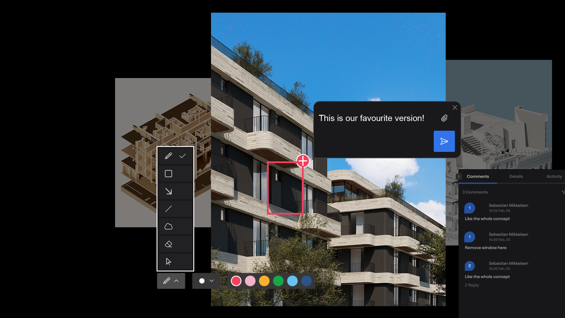 Conectado directamente a Lumion View y Lumion Pro, convierte sus representaciones en espacios de proyecto dinámicos donde los equipos y los clientes ven, discuten y se alinean en tiempo real.