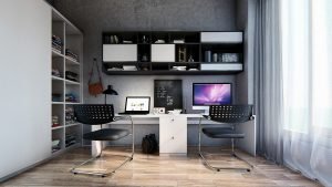 Completando esta oficina en casa con un escritorio compartido, armario, ropa y otros muchos pequeños objetos, es fácil que los clientes se emocionen al utilizar el espacio una vez esté terminado.