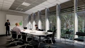 En este render de una sala de reuniones, la gente en 3D ayuda a comunicar 1) la función del espacio tal cual es 2) tamaño, escala y masa.