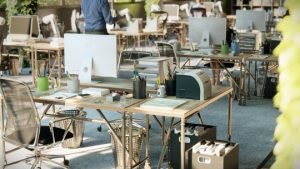 Muestra a tus clientes el bullicio de su nueva oficina renderizando una escena con ordenadores, mesas de escritorio, sillas, gente, papeles, bolígrafos y más.
