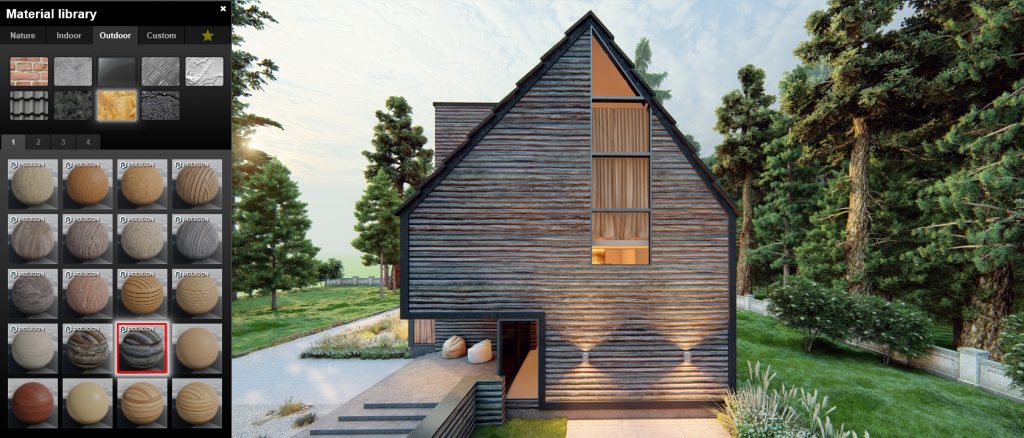 También podrás mostrar la belleza de las cabañas y otros edificios de madera con dos de los nuevos materiales para muros, disponibles en la biblioteca de materiales -> exterior -> madera.