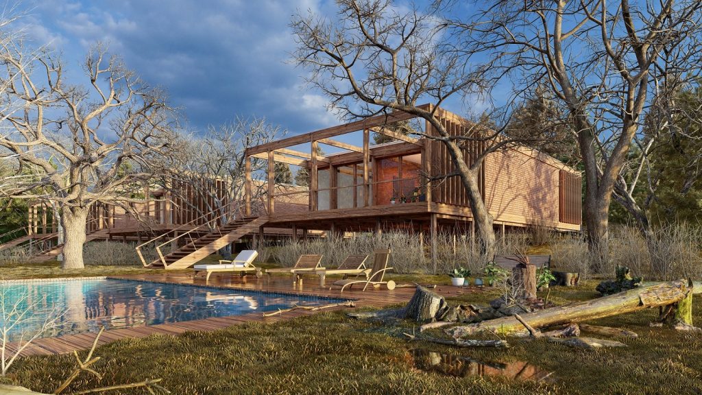 En conclusión, con Lumion 9.5, puedes disfrutar de nuevos árboles y objetos de bosque para incluir un ambiente natural en el diseño. Además, crea un ambiente acogedor con los nuevos materiales de madera y ladrillo.