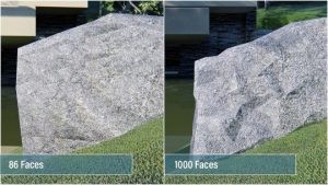 Los objetos 3D con un mayor número de polígonos tendrán una mayor calidad (extrusiones, cantos biselados, etc.), pero estos modelos altamente detallados también requieren un mayor rendimiento del ordenador. Además, la construcción ineficiente de objetos 3D puede llevar a un gran número de polígonos para una pequeña mejora en los detalles. Por ejemplo, un árbol puede incluir 2.000 polígonos mientras otro, de una apariencia similar, puede contener 20.000 polígonos (si está construido de manera ineficiente). Si estos árboles son simplemente objetos secundarios, entonces puede que estés creando innecesariamente una escena muy pesada en Lumion.