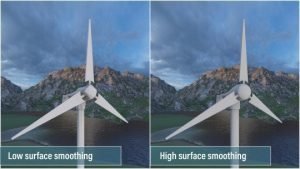 El deslizador “Suavizar superficie” determina la complejidad del modelo así como la apariencia de las superficies curvadas. Baja suavidad de la superficie, por ejemplo, tiene como resultado un modelo más ligero y menos complejo; una alta suavidad de la superficie tiene como resultado un modelo más complejo y más pesado. Puedes ver estos resultados en la imagen que hay más abajo.