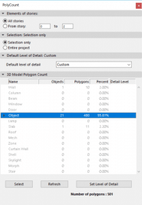 Para ver cuántos polígonos hay en el modelo ArchiCAD, puedes descargarte el complemento Herramienta de recuento de polígonos. La Herramienta de recuento de polígonos puede ayudarte a controlar el número de polígonos 3D en el modelo y también puede mostrar el número de polígonos 3D agrupados por tipos de elementos (muros, losas, puertas, ventanas, objetos, etc.).