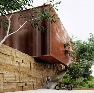 Un exterior de acero Corten oxidado se asienta sobre una pared de piedra texturizada. Renderizado en Lumion.