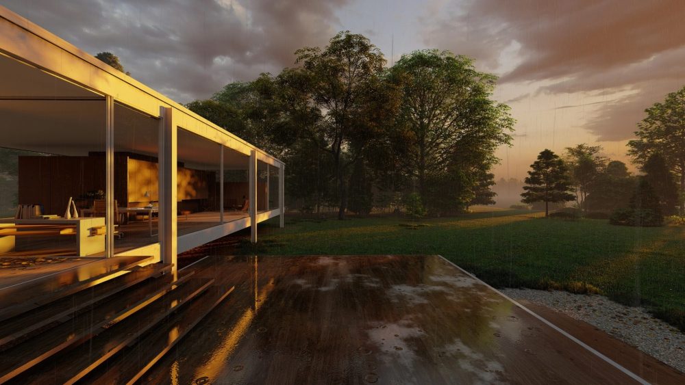 Además, la Casa Farnsworth es perfecta para probar el nuevo efecto de las líneas de lluvia, así como el efecto de Precipitación. Con las grandes ventanas de vidrio, tienes la oportunidad de renderizar un par de vídeos de gotas de lluvia corriendo por el vidrio o una tormenta que se forma en la distancia.