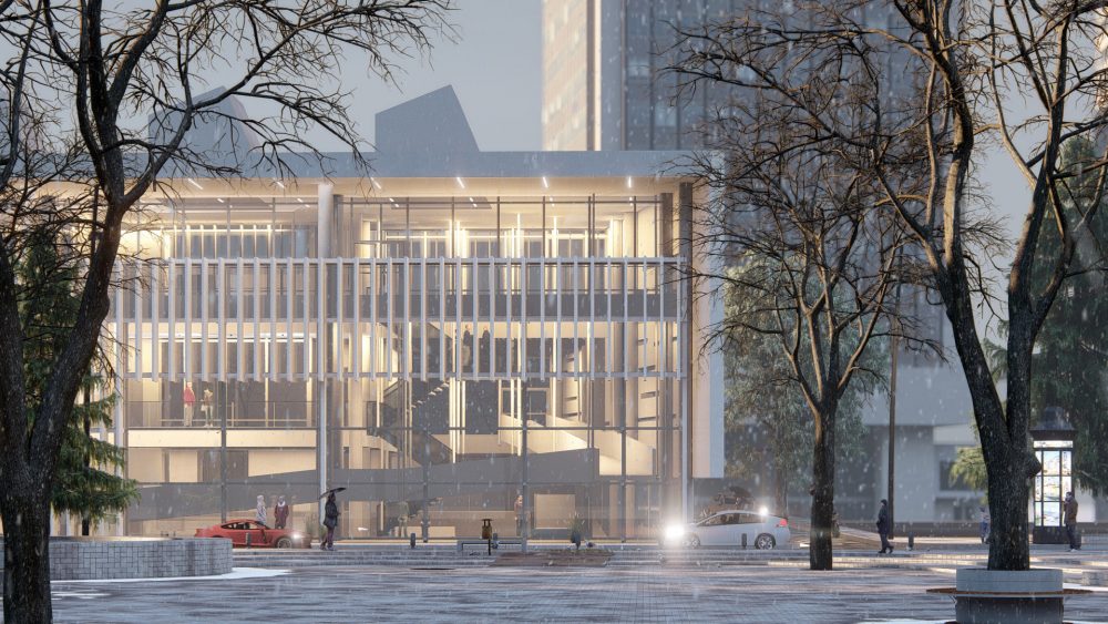 El proyecto de ejemplo de desarrollo de un museo proporciona un entorno urbano animado con un llamativo edificio comercial en una calle muy transitada. Este proyecto, diseñado por Obra Visual, demuestra la energía y el movimiento de un entorno urbano ambientado en un día invernal.